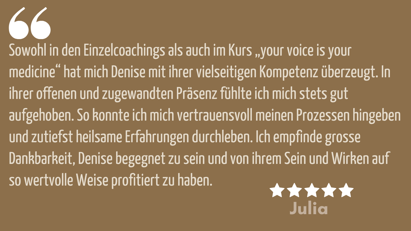 Sie bildet die Verbindung zwischen deiner Innenwelt und der Aussenwelt. Mit ihr machst du deine Bedürfnisse und Anliegen hörbar und zeigst dich im Alltag. Stimme ist Schwingung. Mit jedem Wort erzeugst du eine Wirkung und gestaltest so deine Beziehungen und deinen Alltag.